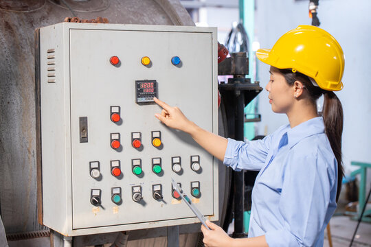 Woman engineer using computer operating CNC machine for cutting wood in furniture factory. Female technical maintenance and programing to machine for making wooden product.