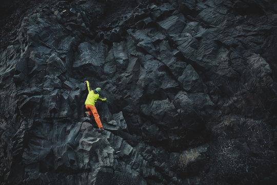 male rock climber. rock climber climbs on a black rocky wall on the ocean bank in Iceland, Kirkjufjara beach. man makes hard move without rope.