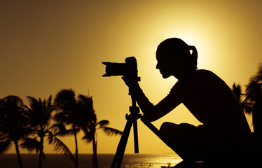 Closeup woman hands holding DSLR camera changing focal distance and focus. Photographer woman closeup making photo on travel. Traveler blogger shoot digital content for blog or social media