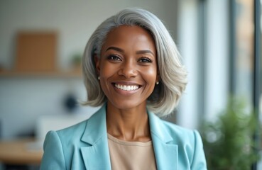 Portrait of smiling black business woman in formal wear. Happy corporate leader, consultant, manager, employee. Confident attractive female with stylish grey hair, business suit. Successful career in