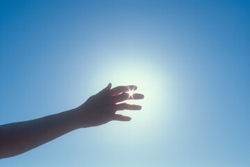 Blurred image of a young woman with reaching hand or giving hand to someone