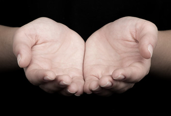 hand reaching forward, with a graceful and deliberate gesture. The hand, isolated on a white background, is stretched out with the fingers spread, as if inviting or asking to take