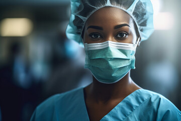 Waist up portrait of young African American woman as female surgeon with medical team in operating room