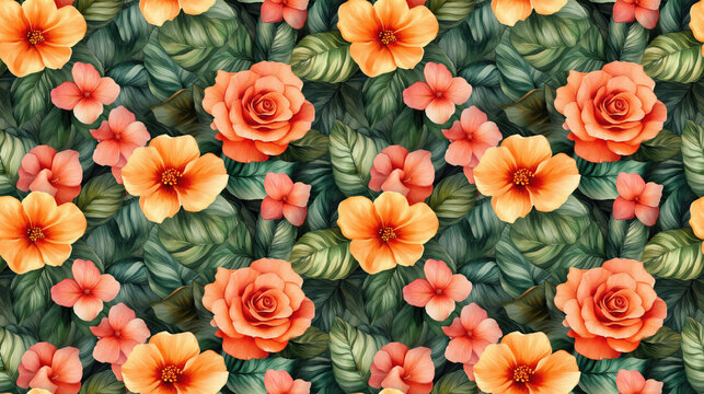 Seamless watercolor floral pattern featuring a vibrant bouquet of tropical roses perfect for wedding invitations
