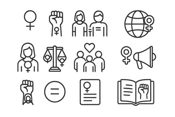 Gender equality and feminism line icon set. Collection of women empowerment, female rights, activism, protest, social justice, unity, diversity vector symbols. Editable stroke.