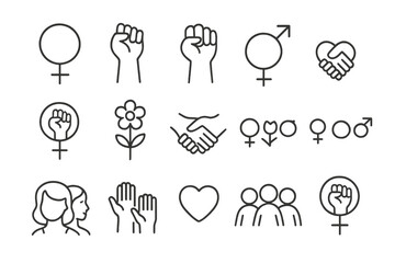 Gender equality and feminism line icon set. Women empowerment, rights, and activism symbols. Female power, protest, social justice, and equal opportunity vector collection.