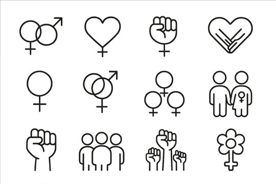 Vector line icon set of gender, feminism, and solidarity symbols. Female empowerment, equality protest, and love signs. Woman power, LGBTQ, and community concept icons.