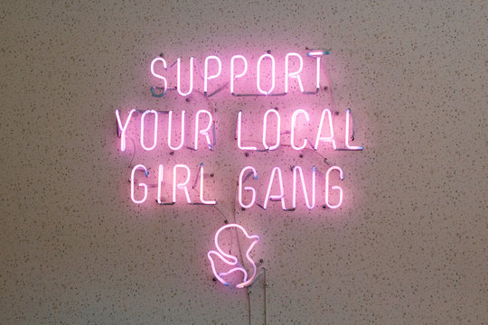 Girl power. Female movement feminist symbols, stickers or comic bubbles and slang words, short quotes grl pwr, body positive and gender equality, woman society and solidarity vector set