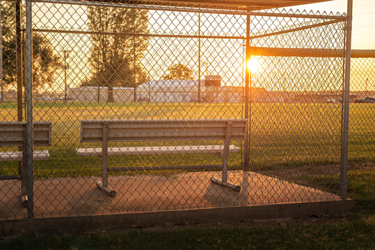 An artistic UHD image of a baseball bat leaning against a chain-link fence, with the field bathed in golden hour light and the anticipation of the upcoming game palpable in the air.