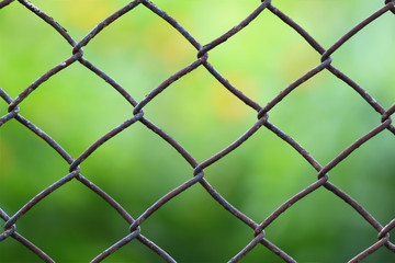 Green metal net chain link baseball field fence barrier isolated on horizontal green grass environment background.