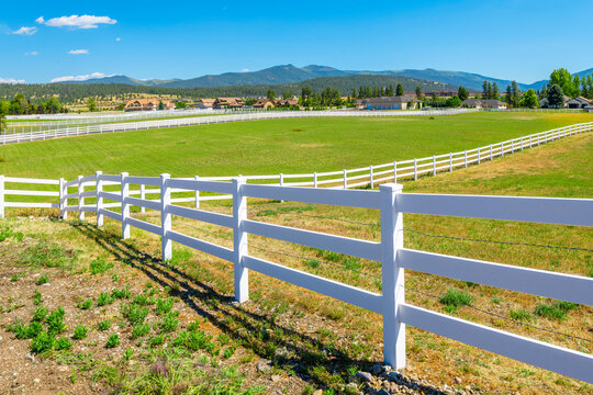 A large ranch in the Spokane Valley area near the Idaho border with Coeur d'Alene, with extensive vinyl 3 rail fencing and cross-fencing, in Spokane, Washington USA.