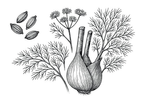 Detailed botanical illustration of fennel bulb, fronds, flower, and seeds, rendered in classic black and white line art.