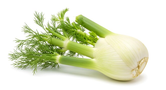 Fresh fennel bulb with feathery fronds ready for culinary use in salads, soups, or roasted vegetable dishes on a clean white backdrop for food photography