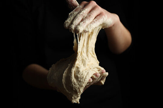 Creation of liquid dough, massage with hands. Sourdough close-up.
