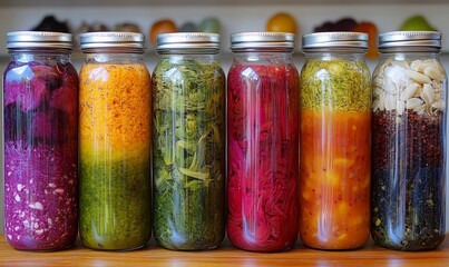 Assorted vibrant fermented foods neatly arranged in clear glass jars showcasing colorful vegetables grains and spices against a rustic kitchen background ideal for a healthy lifestyle scene