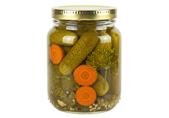 Pickled cucumbers and carrots in a glass jar isolated PNG, homemade fermented vegetables for healthy eating on transparent background