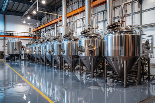 Modern stainless steel fermentation tanks in craft beer brewery production line