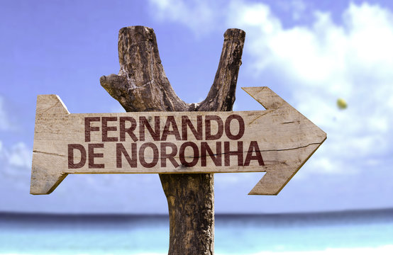 Fernando de Noronha wooden sign with a beach on background