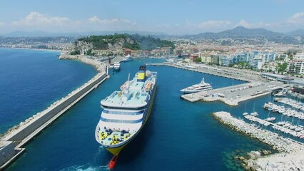 Cityscape with ferryboat Mega Express Two sails in port of Nice