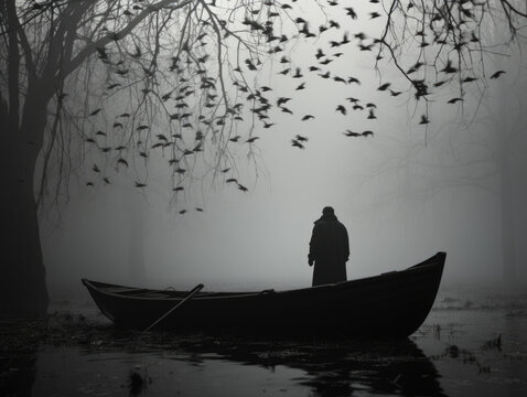 Whisps of Lost Souls Float Around, In the Style of Intimately Evocative Moody Fog, The Ferryman Standing on His Gondola, Minimalist, Serene. Generative AI..