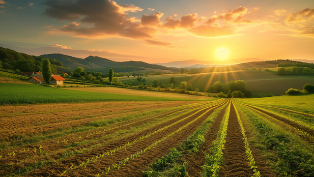 Wide-angle view of lush green rice fields with rows clearly visible, bathed in golden sunlight shining through clouds during sunset