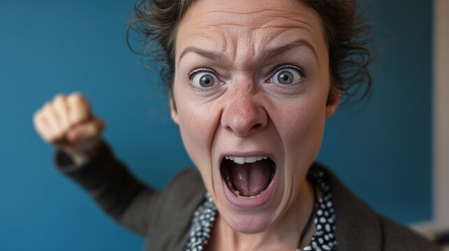 Femme exprimant une colère intense avec un grand sourire et les bras levés