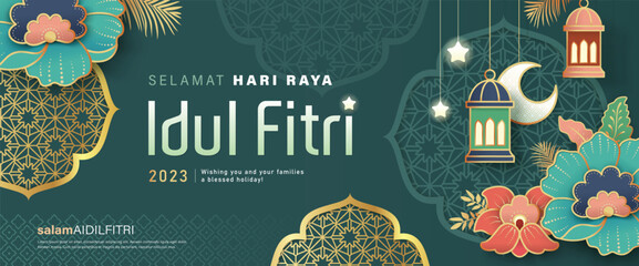 Islamic festival poster background design with flowers and lanterns, suitable for Ramadan Kareem , Hari Raya, Eid Mubarak, Eid al Adha.