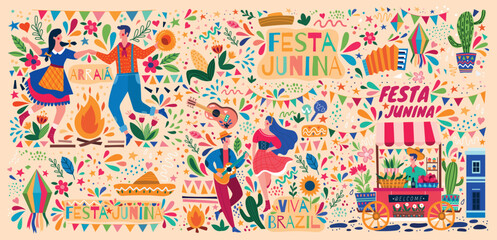 Festa junina template. Young men and women dance in traditional Mexican dress, Latin American style. Entertainment and events, festival, holiday and celebration. Cartoon flat vector illustration