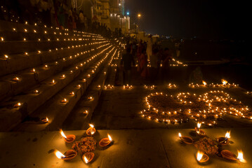 Happy Diwali. Burning diya oil lamps and flowers on a pastel background. Traditional Indian festival of light. Celebration of a religious holiday. Copy Space