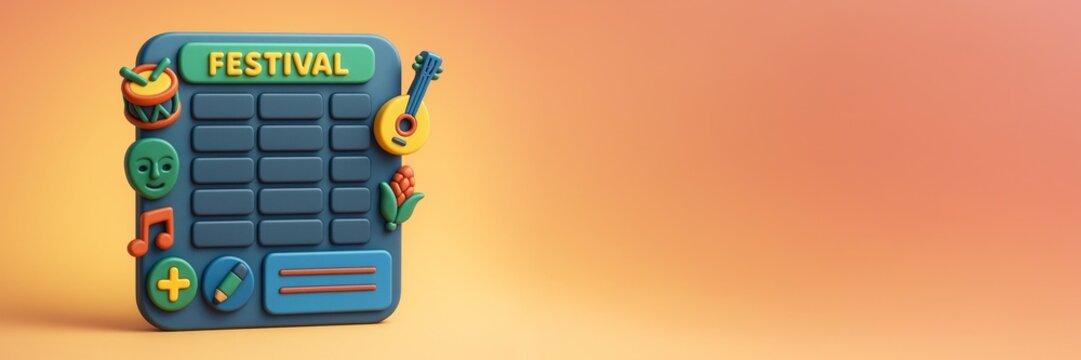 Colorful festival schedule mockup with music and celebration icons on left side and blank space on right for design or copy on orange background. Ai generative