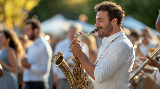 Jazz band performs lively tunes at summer festival with enthusiastic crowd enjoying the outdoor atmosphere