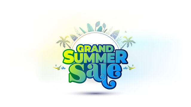 Grand Summer Sale, discount, offer and deals promotion logo and Poster. Tropical background with 3d typography.