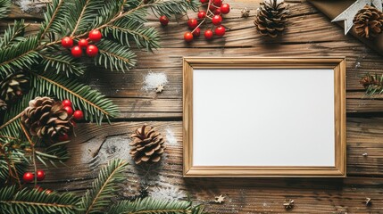 Festive card or picture frame on wooden surface