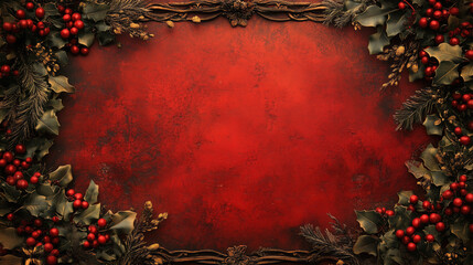 Festive Christmas frame with red berries,green leaves on red background in Victorian style.Vintage winter scarlet background for holiday cards and invitations.