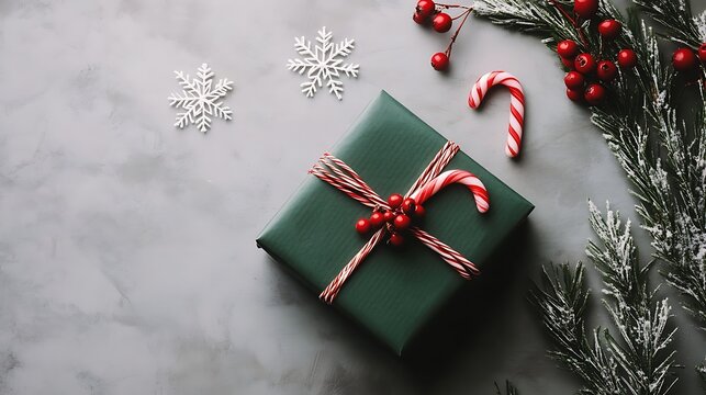 Flat lay of holiday gift green box red berries candy cane snowflakes and festive bell
