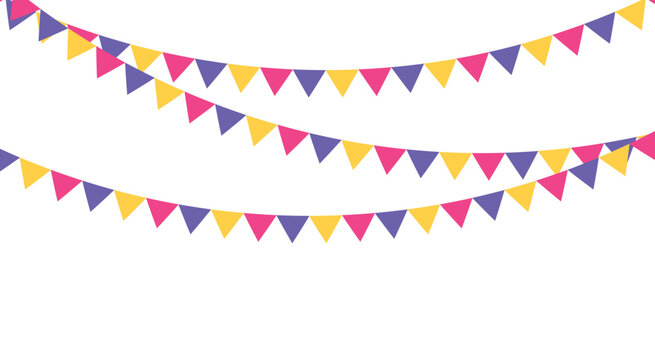 Colorful festive bunting flags hanging, bright celebration decoration, isolated on white background.