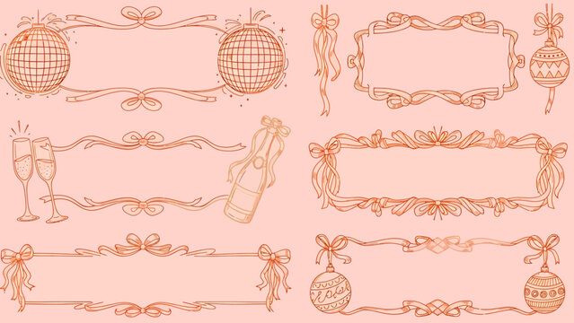 Composición de Diseño 'Flat Lay' de Lujo para Navidad y Fin de Año, Presentando un Marco Decorativo con Esferas Doradas, Cintas Rojas y Verdes, Elementos de Pino y Estrellas
