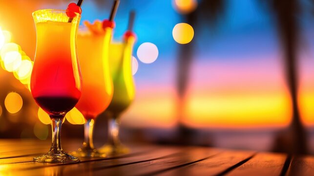 Colorful cocktails on a wooden table at sunset, with blurred light and palm trees in background