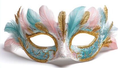 Ornate Venetian mask, pastel colors.  Decorated with feathers, glitter and gold accents