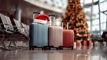 A Christmasthemed photograph featuring a collection of suitcases with Santa hats on them, set against a backdrop of a festive indoor setting. The suitcases are of varying sizes and colors.