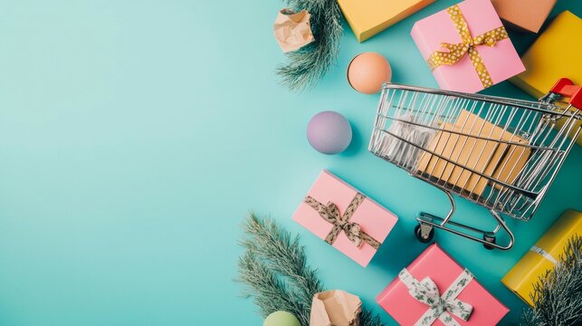 Shopping cart gifts vibrant minimal background festive photography concept