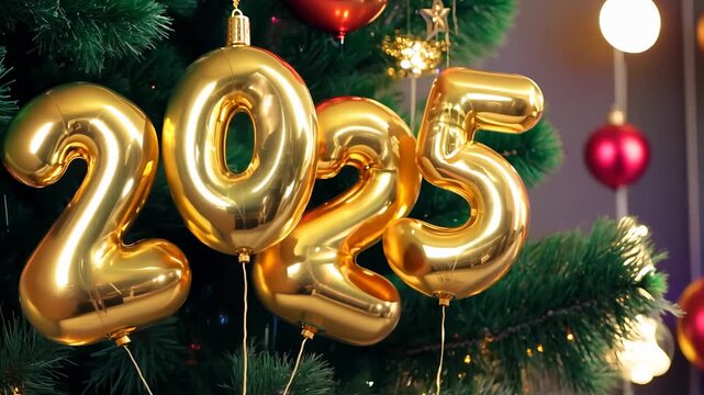 Golden balloons displaying 2025 near christmas decorations in a festive setting
