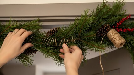 little girl making Christmas greeting card at table in room decorated for Christmas
