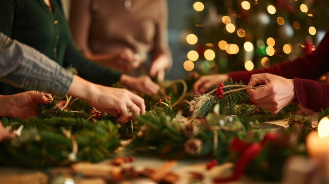Guests at a festive table engaging in crafts and decorating wreaths. Creative and joyful scene, artificial indoor lighting.