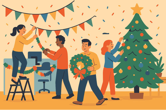 A cozy image of families decorating the Christmas tree with garlands and tinsel, getting into the festive spirit and traditions.