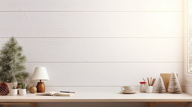 a cozy and festive workspace by featuring an empty white wall as a mock-up background. a desk with holiday-themed stationery and decorations. a vase with green fir branches for a touch of nature.