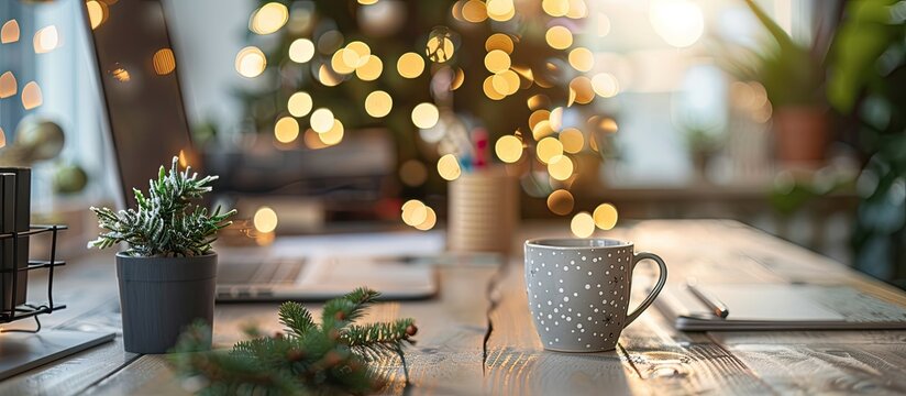 Desk decorated for Christmas with a festive ambiance and copy space image