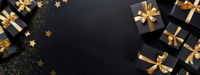 Black gift boxes arranged on dark background, black friday discounts concept