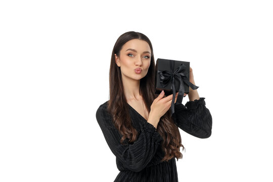 Woman joyfully holds a gift on Black Friday, isolated, PNG
