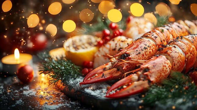 Gourmet candlelit seafood feast featuring grilled lobsters, prawns, and assorted side dishes